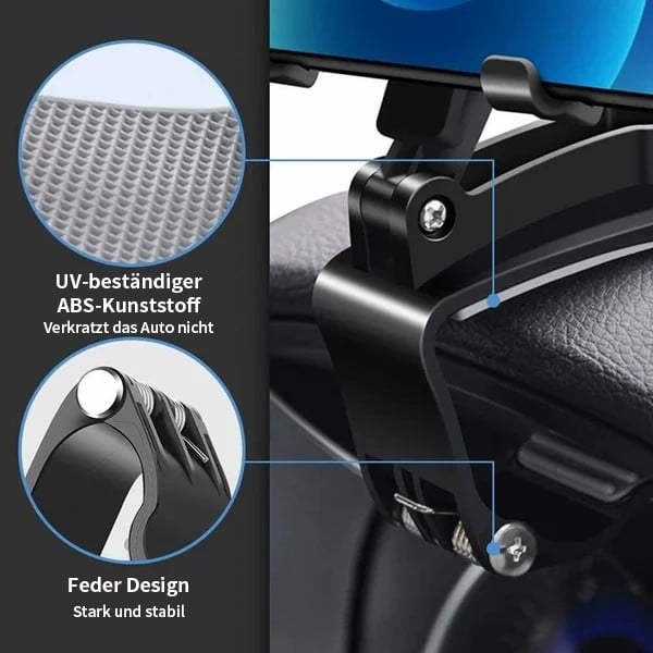 Ein stabiler Handyhalter fürs Auto ist an allen belasteten Teilen mit hochwertigem rutschfestem Gummi ausgestattet und kann fest auf dem Armaturenbrett montiert werden. Die ausziehbaren Klammern halten das Handy sicher fest, um Abnutzung und Herunterfallen des Smartphones zu verhindern, wodurch Ablenkungen durch Aufheben vermieden werden. Selbst auf unebenen Straßen wackelt er nicht!