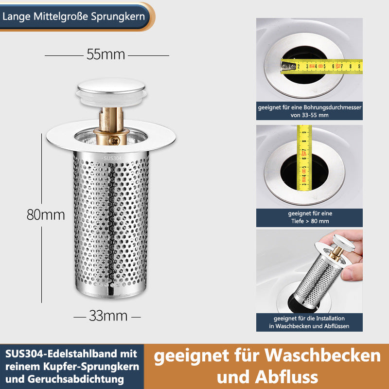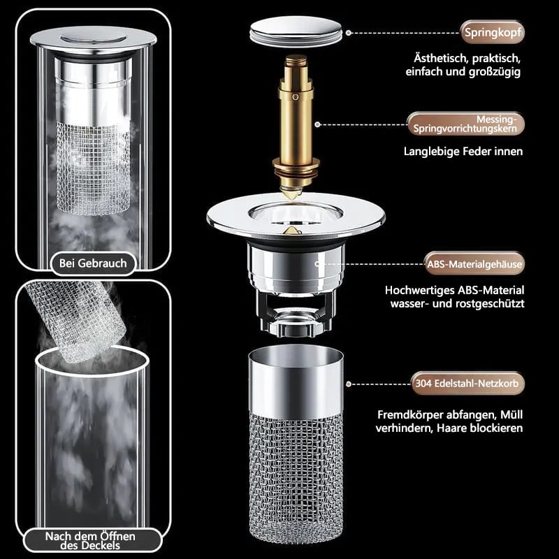 Im Gegensatz zu herkömmlichen Druckknopf-Abflüssen verfügt dieser Abflussstöpsel über einen Anti-Verstopfungs-Korb, der Haare ordentlich auffängt und verhindert, dass der Abfluss verstopft. Kein Schmuck, Ringe, Schmutz oder andere Dinge gelangen in das Abflussrohr.