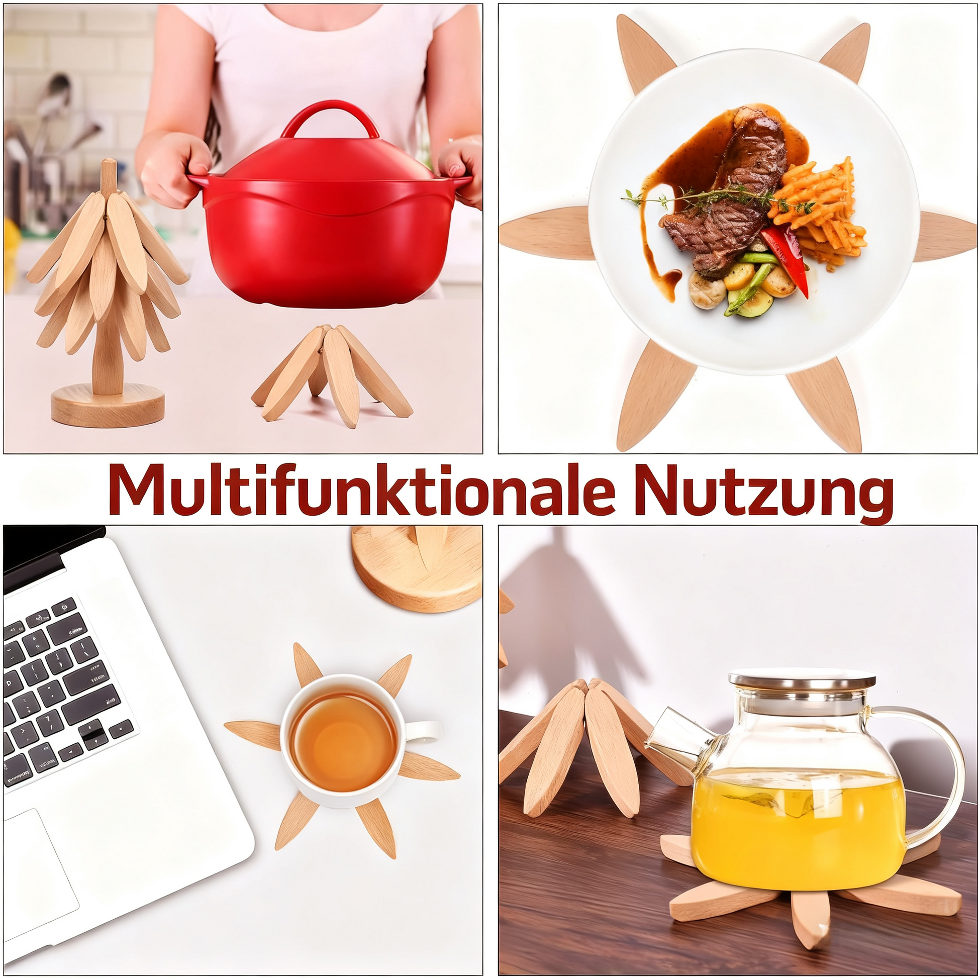 Jeder Untersetzer besteht aus 6 Holzsegmenten, die sich automatisch entfalten, sobald ein heißes Gericht daraufgestellt wird – macht Spaß in der Anwendung!