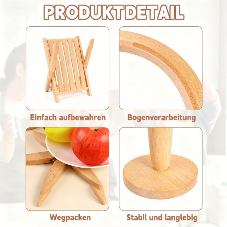 4 Holzuntersetzer + 1 Ständer schützen Arbeitsplatten vor Hitzeschäden – stylisch und funktional.