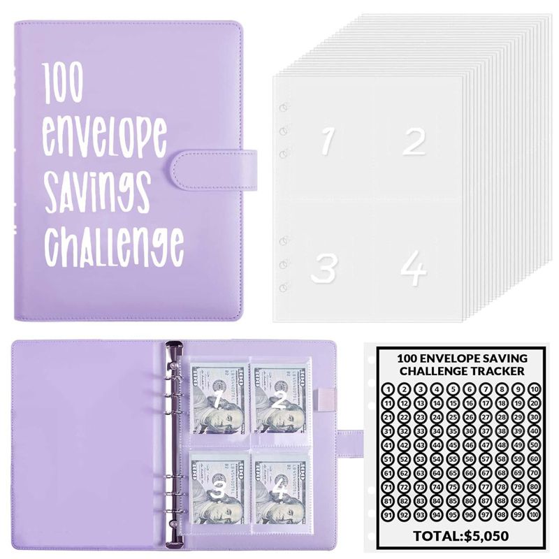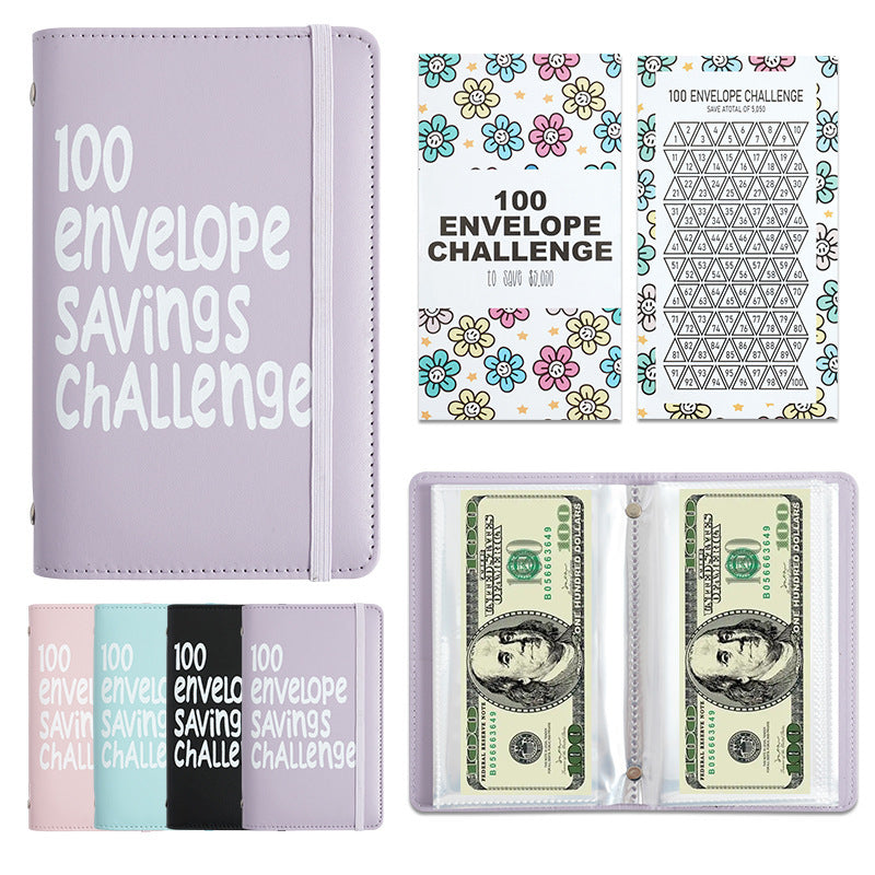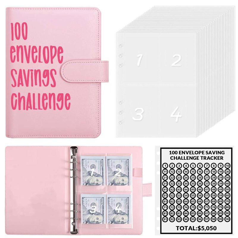 MONEY SAVINGS BINDER KIT: A5 imitation leather binder, 1 page double-sided & laminated tracker, and 100 envelope slots pre-numbered with 1 to 100. 100 Envelopes money-saving challenge helps you build up an emergency savings fund and cultivates a saving habit.